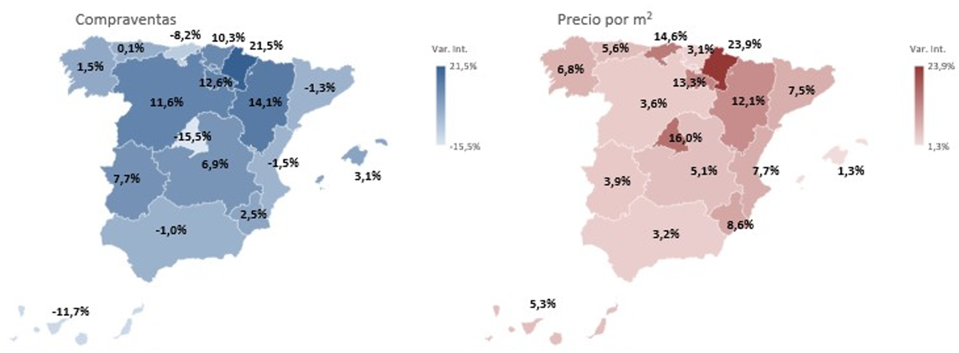 La compraventa de vivienda creció en 11 comunidades autónomas y se redujo en 6. Destacan los incrementos de Navarra (21,5%), Aragón (14,1%), La Rioja (12,6%) y Castilla y León (11,6%) y, en el polo opuesto, las caídas en Madrid (-15,5%), Canarias (-11,7%), Cantabria (-8,2%), Comunidad Valenciana (-1,5%), Cataluña (-1,3%) y Andalucía (-1%).