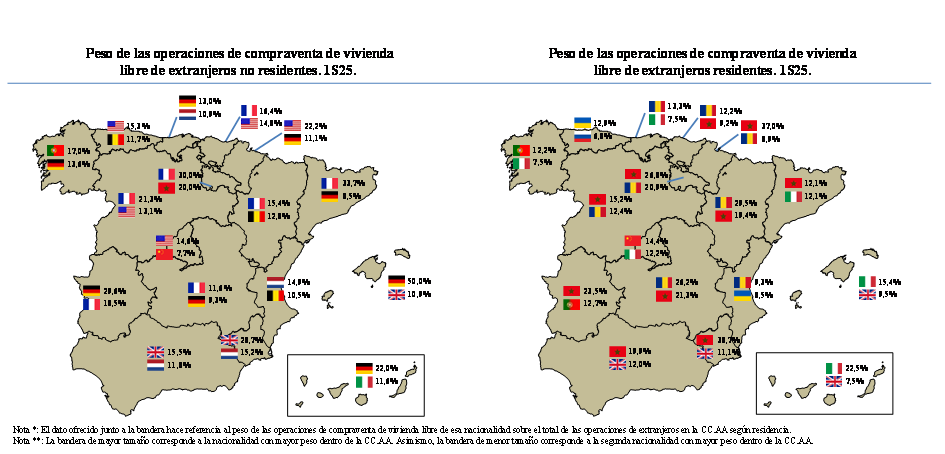 En consecuencia, el crecimiento de las compraventas de extranjeros en la primera mitad de 2025 se explica fundamentalmente por el aumento de las operaciones de residentes, frente al retroceso observado en los no residentes.